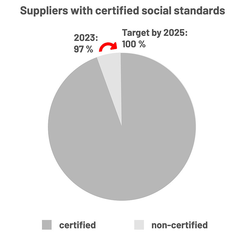 Through regular surveys of our suppliers, we will create complete transparency in the value chain by the end of 2025. In countries outside the EU, Great Britain and the EFTA countries, we are increasing cooperation with suppliers (turnover > 0.3 % of purchasing volume) who are certified according to a recognised social standard (e.g. BSCI/Sedex) from 97 % to 100 %. In addition, we enter into a dialogue with our suppliers and provide feedback on the results of the supplier survey.