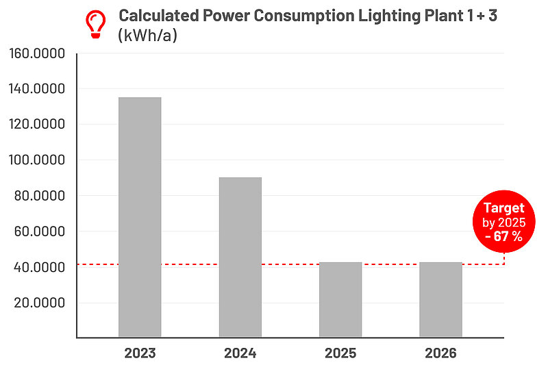 By the end of 2024, we will have reduced our electricity consumption by 55 % by continuing to use energy-efficient lighting (e.g. LEDs and motion/presence detectors) at the production sites (Plant 1 and Plant 3), from 142,000 kW/h to approximately 65,000 kW/h per year. This results in an annual saving of 20.7 t CO². In addition, we will contribute both green electricity and our own sustainable energy generation at all locations by 2025 (e.g. by installing photovoltaic systems).